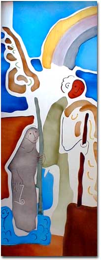 Raphael begleitet den jungen Tobit von Ninive nach Ekbatana und führt ihn zu dem Haus der Cousine Sara und begleitet ihn wieder zurück zum Vaterhaus.